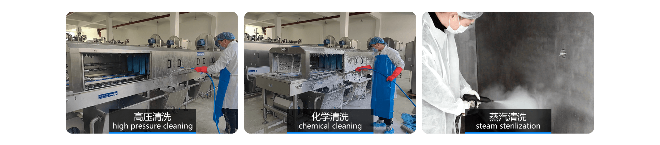 Оборудование следует концепции высокой защиты и легкой очистки, вся машина водонепроницаема и защищена от влаги, что позволяет проводить прямую мойку высоким давлением, химическую очистку, стерилизацию паром и т.д. Применяются бесшовная сварка, полировка панелей и скрытая проводка внутри труб, что исключает гигиенические мертвые зоны и уменьшает вероятность оставления загрязнений после чистки. Элементы, такие как боковые панели, трубы и форсунки в туннеле, разработаны для легкого демонтажа, что позволяет глубоко очищать внутренние пространства. Входы и выходы туннеля оборудованы водяными занавесями для предотвращения утечки воды и пара, поддерживая санитарию цеха.