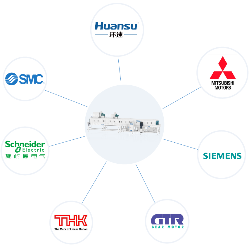 Оборудование изготовлено из высококачественных материалов с тщательной отделкой и стабильными функциями, что обеспечивает длительный срок службы. Вся машина выполнена из нержавеющей стали марки 304, устойчивой к ржавчине и коррозии. Электрические компоненты поставляются от международных брендовых производителей, что гарантирует качество. Электрический шкаф водонепроницаемый и пылеустойчивый, оборудован устройствами защиты от перегрузок и утечек тока, обеспечивая высокий уровень безопасности. ПЛК обладает мощной способностью противодействия помехам и стабильной работой.