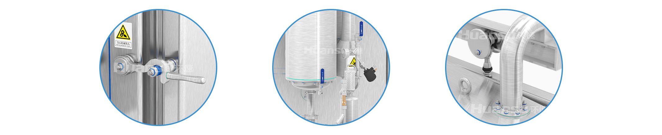 Оборудование использует новые разработанные собственные компоненты, в сочетании с резиновым уплотнением, бесшовной сваркой и шлифовкой, что обеспечивает гладкость внутренних и внешних поверхностей оборудования без зазоров и предотвращает накопление грязи. Оно имеет двойное топливо, используя энергию пара, что позволяет дезинфицировать неочищаемые трубопроводы во время создания вакуума. Двускатная конструкция крыши предотвращает загрязнение пищевых продуктов каплями воды сверху.
